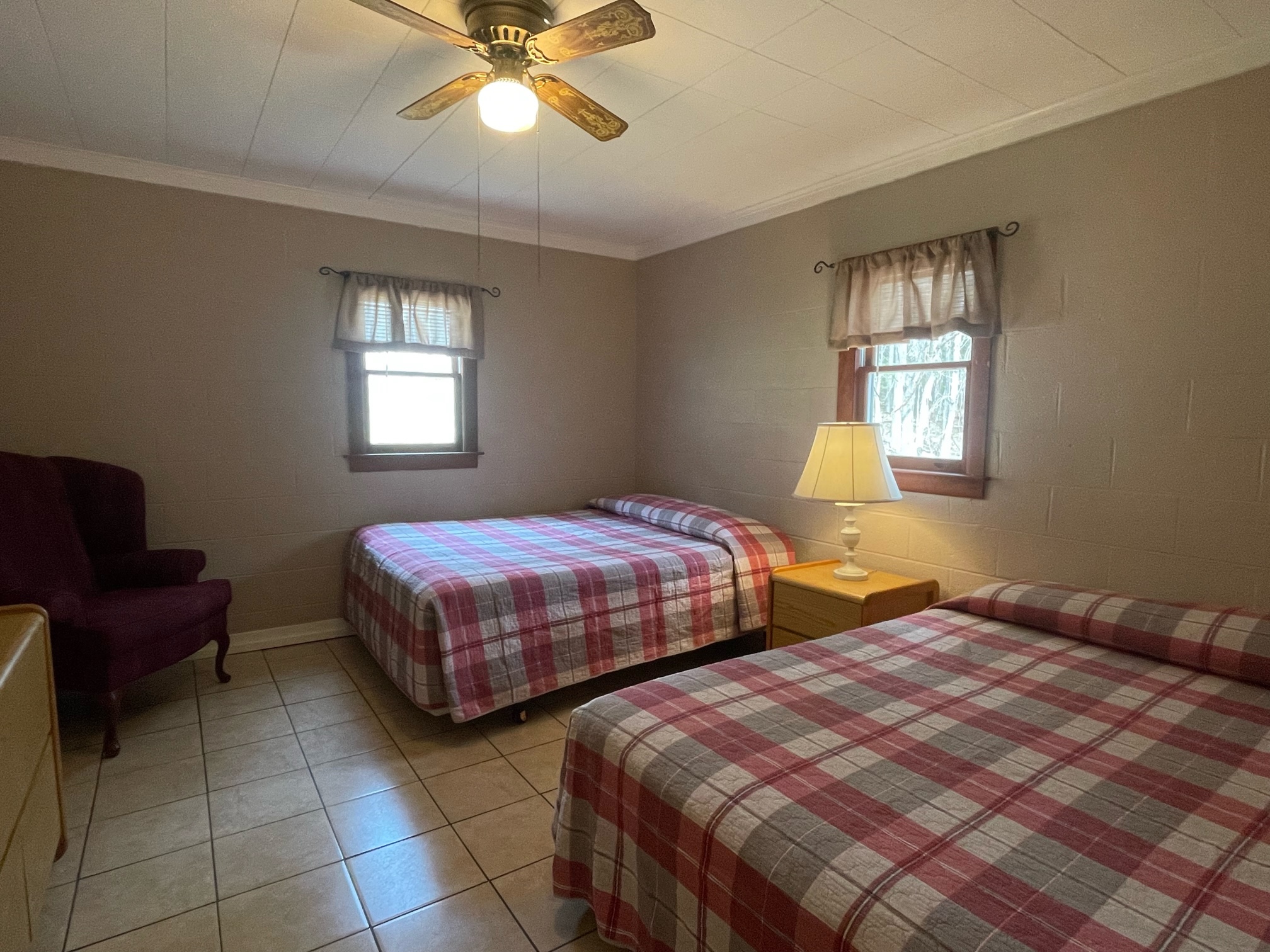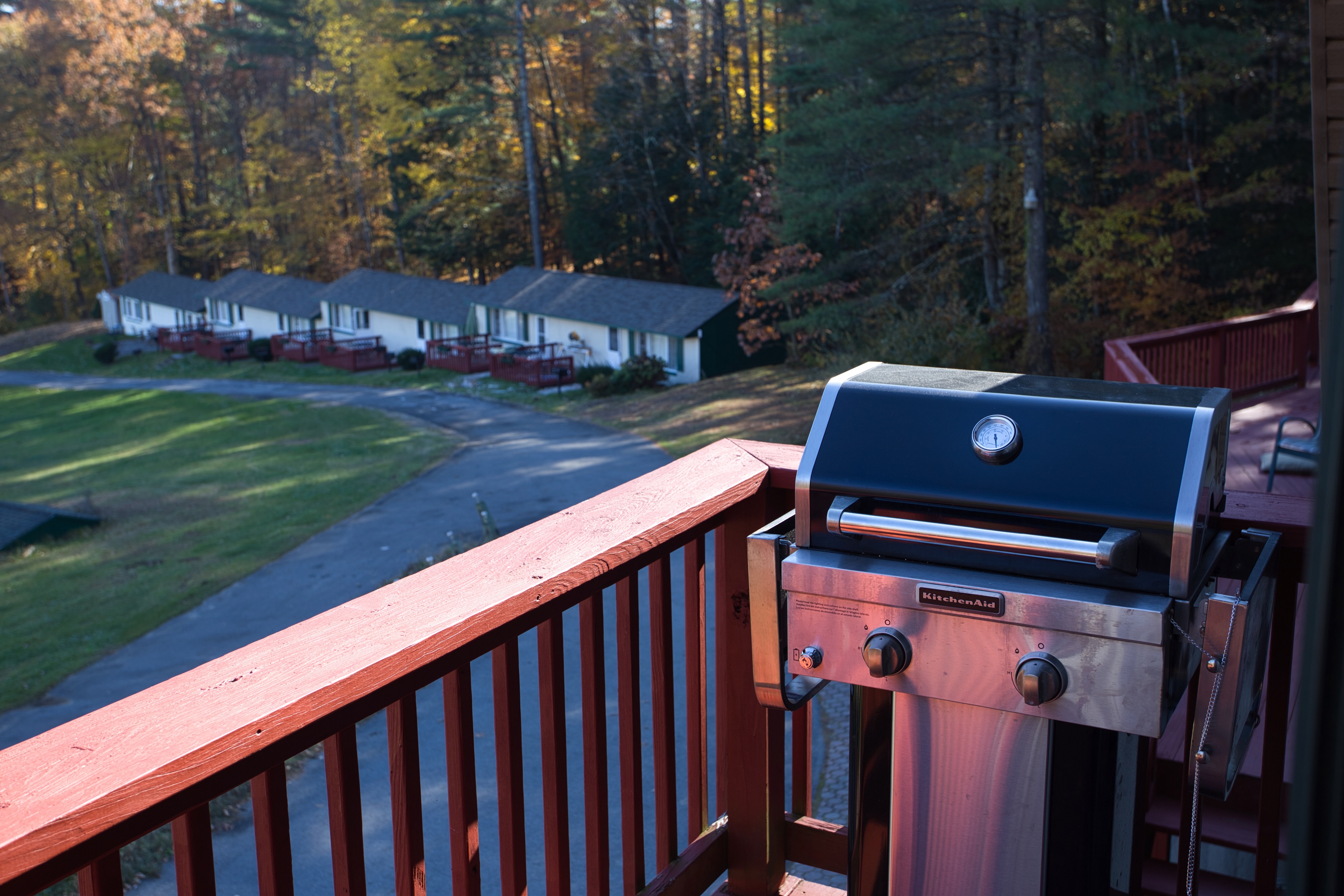 Motel Efficiency room with 2 Queen Beds. The room has air conditioning, cable TV, heat, and bathroom with stall shower. In front of the room is a private deck with beautiful mountain views and a barbecue grill. The kitchenette has a cook-top, small refrigerator, sink, microwave, coffee maker, toaster and pots, pans, and dishes.