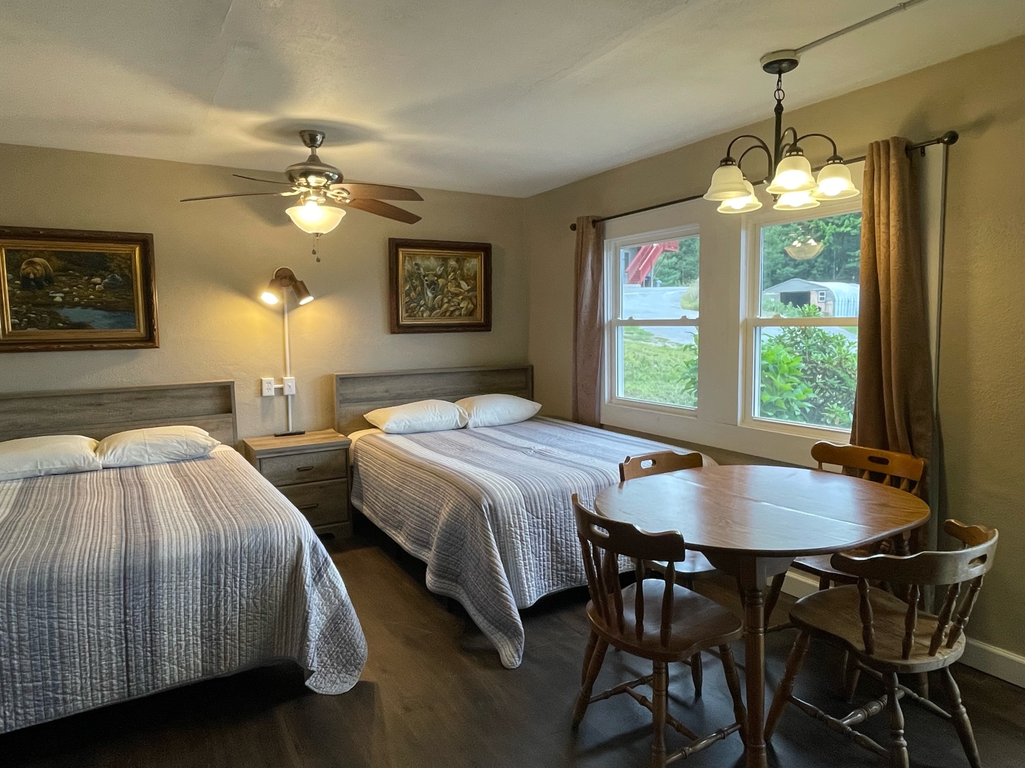 Motel room with 2 Queen Beds. The room has air conditioning, heat, cable TV, and bathroom with stall shower. In front of the room is a private deck with beautiful mountain views and a charcoal grill. The room has a small refrigerator, microwave, and coffee maker.