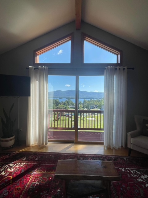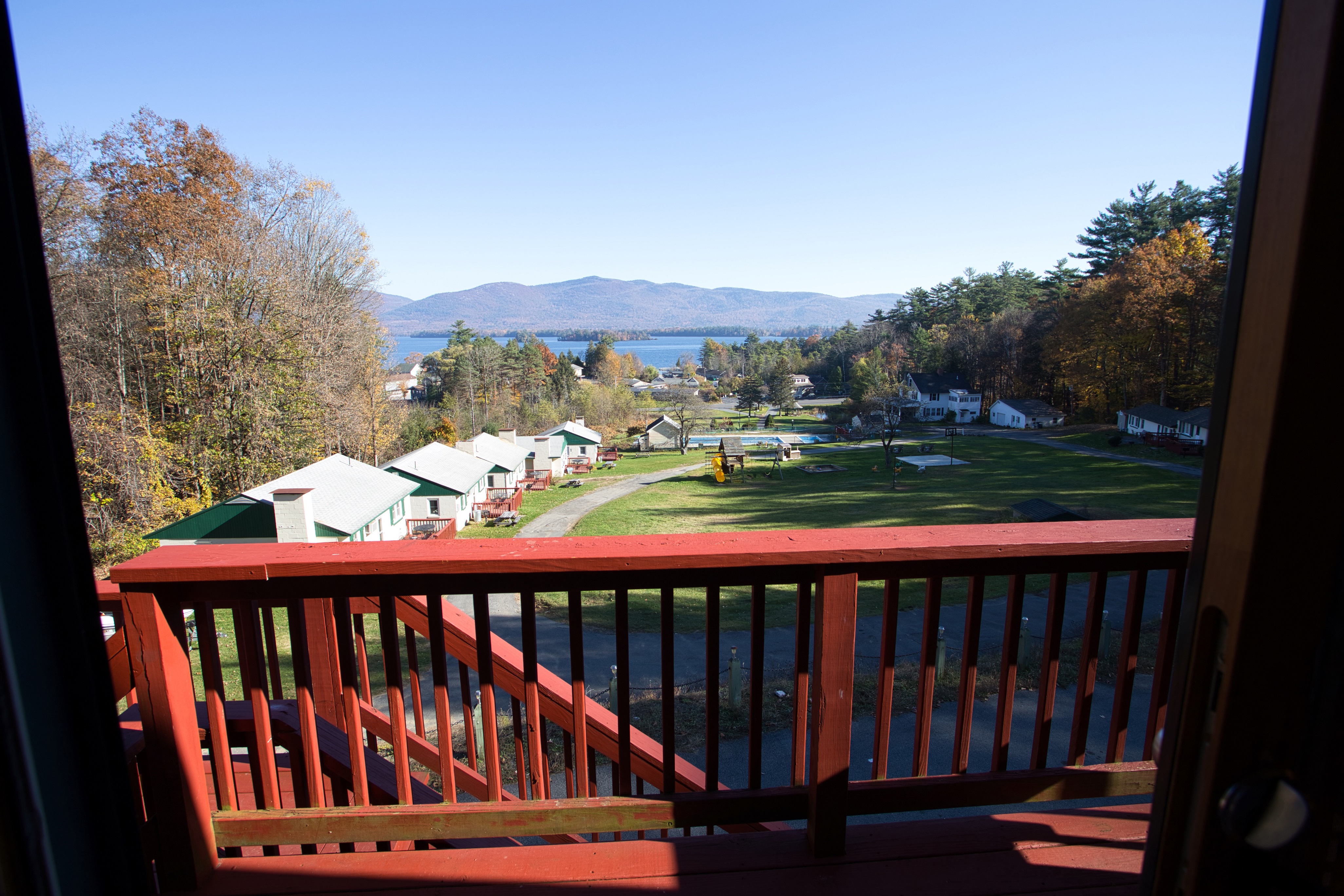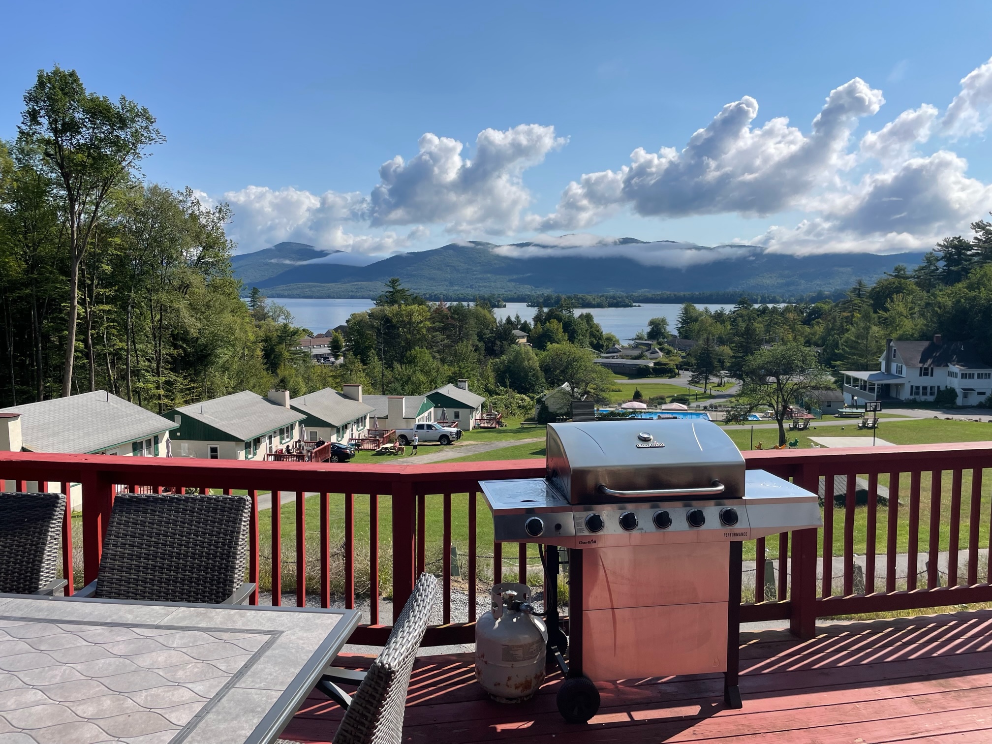 Quaint 2 bedroom Chalet with beautiful views of Lake George and the surrounding mountains. The Chalet is pet friendly. This unit is part of a resort with a heated pool, Lake George beach access a short walk away and across the street, and other amenities. Unit has 2 bedrooms a full kitchen, dining area, living room, and laundry closet. Living room has a fold-out couch. Maximum occupancy is 6. There is a small deck off the front with a gas barbeque grill. Chalet is on 2nd floor requiring going up a flight of stairs. Bed linens provided. Guests provide bath and pool towels.